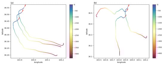In this experiment, three aircraft were involved and well-trained models were used to test the team guidance performance of multi-aircraft. Figure 14 is a color map figure which shows the 2D trajectories and the arrival times of aircraft, where the color map value such as −100 is the delta of current time and final time in seconds. Figure 15 shows the 3D trajectories how the aircraft flew to the aimed for 4D waypoint, where three aircraft started within the predetermined scope in the same aerospace (Figure 15a) and different aerospaces (Figure 15b), and aircraft aimed at the series landing 4D waypoints, respectively. The simulation results are shown in Table 6, both the average distance and delta heading angle were in the tolerances within 2 km and ±28°. The simulation results show that the trajectories can be generated to guide aircraft to a series of 4D waypoints.