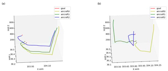 Trajectories of aircraft trained in team aircraft guidance: (a) three aircraft starting in the same aerospace, flying to the aimed for 4D waypoints, respectively, and (b) three aircraft starting in different aerospaces, flying to the aimed for 4D waypoints, respectively.