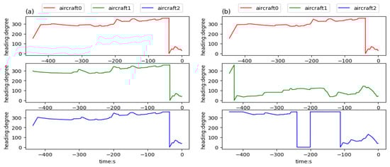 Headings of aircraft trained in team aircraft guidance: (a) three aircraft starting in the same aerospace, flying to the aimed for 4D waypoints, respectively, and (b) three aircraft starting in different aerospaces, flying to the aimed for 4D waypoints, respectively.