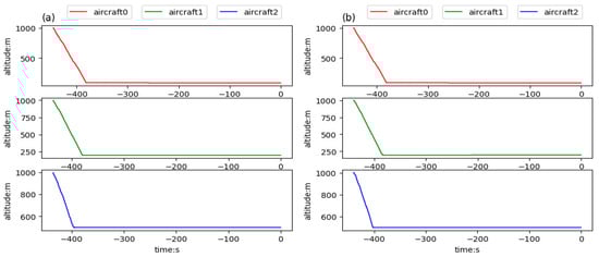 Altitudes of aircraft trained in team aircraft guidance: (a) three aircraft starting in the same aerospace, flying to the aimed for 4D waypoints, respectively, and (b) three aircraft starting in different aerospaces, flying to the aimed for 4D waypoints, respectively.