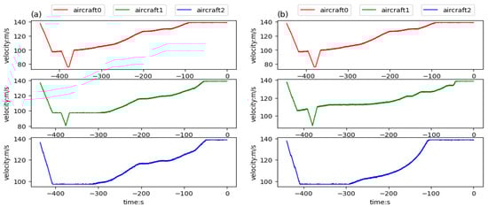 Velocities of aircraft trained in team aircraft guidance: (a) three aircraft starting in the same aerospace, flying to the aimed for 4D waypoints, respectively, and (b) three aircraft starting in different aerospaces, flying to the aimed for 4D waypoints, respectively.