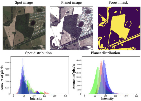 Original SPOT and Planet images (without any enhancements) and their RGB spectral values distribution. The histograms were computed within the forest area. Although the presented images are from the summer period, their spectral values differ drastically, as the histogram shows.
