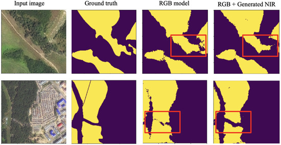 The experiments indicate that the generated NIR provides additional information to the segmentation model. We assume that the generative model incorporates the hidden statistical connections between the spectral channels that can be learned from the significant amount of real RGB and NIR data. As opposed to the segmentation or classification approach, the channel generation does not require the manual ground truth markup to significantly increase the dataset size. Therefore, this approach can be used as a feature-engineering tool to create a new feature similar to the NIR band of multispectral remote sensing imagery.