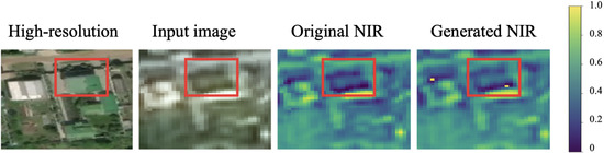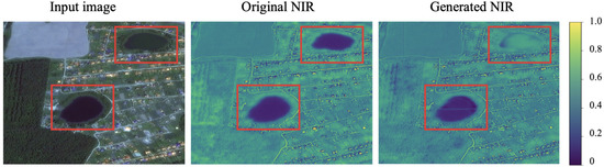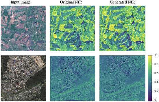 In [12], a similar problem of generating the NIR channel from RGB was described. The proposed solution was based on the K-Nearest Neighbor classification algorithm and was focused on the agricultural domain. The researchers show in [12] a high demand for the generated NIR data, which can solve particular problems. However, the neural network approach was beyond the scope of the present study for image generation. In [13], they generated synthetic spectral bands for archive satellite images using Landsat data. Synthetic satellite imagery generation from Sentinel-2 (with the spatial resolution more than 10 meters per pixel) was considered in [14,15]. However, in our work, we were focused on high-resolution satellite images as they provide valuable texture information.