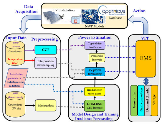 Finally, the PV power forecast is created, and the prediction intervals are selected for the PV facility so that conclusions under a VPP environment can be drawn. In this case, a real PV facility and seven ground-based weather stations in the Community of Madrid are selected to emulate the VPP, obtaining an improvement in the accuracy of with respect to the MAE, and with respect to the RMSE. Similar conclusions can be reached regarding the error as a function of the lead time and the launch time. Therefore, the whole strategy can be applied under different scenarios for launch times higher than 1.5 hours, relying on the day-ahead prediction prior to this. For this case, the error matrixes also indicate the best moments to obtain the predictions of the nodes, making it possible to increase the reliability of the VPP operation.