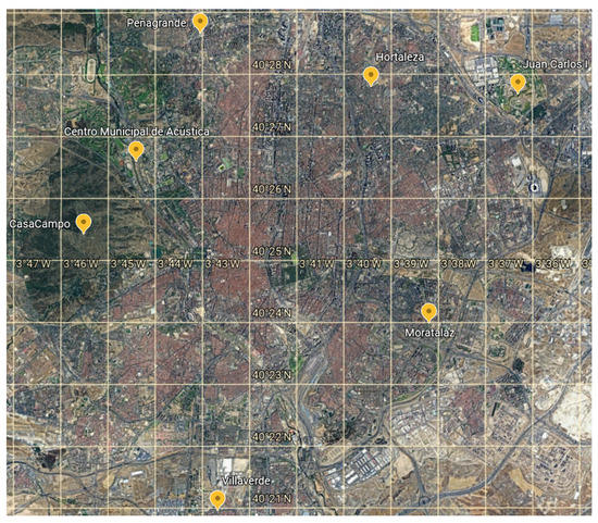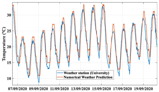 Figure 12. These ground-based stations are equipped with GHI sensors which allow the GHI forecasts to be generated. As for the power conversion, the characteristics of the PV installation from the university are used to obtain the power estimation for each emulated VPP node (peak power,