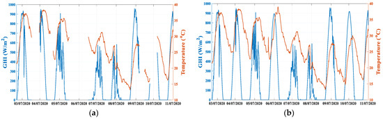 x axis is expressed in solar time. It is worth noting that the experimental setup at the site location has a building near the PV panels that generates partial shadows on some of them, starting from 16:36 and continuing until sunset. This event is also modelled in Equation (2), assuming a linear variation of this effect with respect to time (in