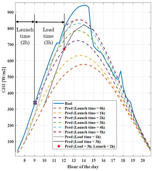 7]. The lead time can be defined as the time difference between the instant when the forecast is launched and the occurrence of the forecasted value, considering the forecast horizon as the maximum forecast lead time. Forecast errors increase with forecast lead time due to the atmospheric motion. As for the model, the optimal method for solar irradiance prediction depends on the forecast lead time [