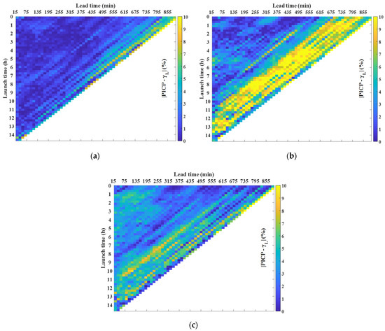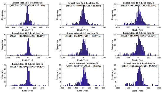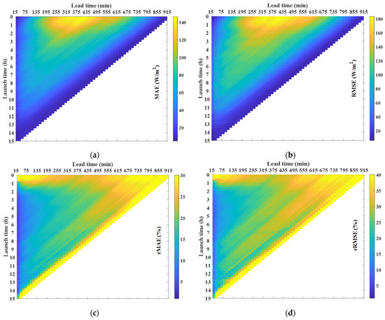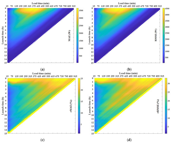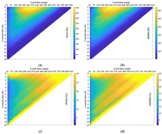 Figure 9 depicts the forecast error in terms of the difference between the measured and estimated PV power as a function of the lead time and the launch time. The shapes of the figures are similar to the previous section, with similar percentage errors. Therefore, from the figure, the same conclusions reached by analyzing