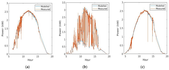 Figure 8 depicts the comparison between the measured values of PV power at the site with respect to the PV power estimation obtained from real GHI measurements taken at the site. Three types of days have been selected: a cloudy day, an overcast day and a sunny day. The