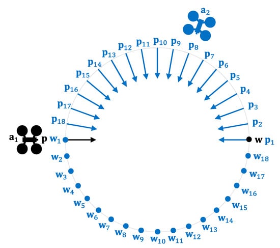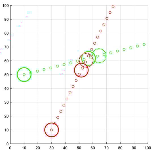 First, we will analyze the behavior of PCAN when . Figure 6 shows the different scenarios evaluated. Given a circumference of in diameter, in all the scenarios starts its flight from the west (point ), crosses the circumference passing through its center, and ends at the opposite point of the circumference (). On the other hand, starts its flight from a different position in each scenario. In particular, we have considered 18 different initial positions for () resulting in 18 relative angles between both UAVs (between 0° and 170°, in 10° intervals). Each initial position () has an associated destination (), which is also reached by passing through the center of the circumference. In each configuration, and start the flight simultaneously, with (), finally colliding at the center of the circumference if the navigation algorithm does not prevent it. We have set , and , and PCAN parameters as , = 50, , and . Moreover, the safety radius has been increased 8.34 m, as Figure 1 shown explains.