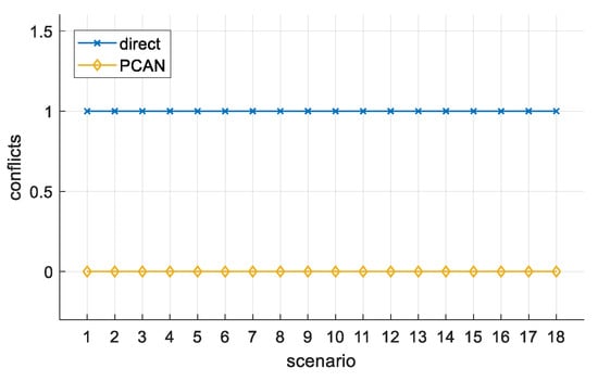 Figure 7 shows a scenario number corresponding to each of the 18 configurations described above on its abscissa axis. The ordinate axis represents the number of conflicts produced in each scenario. The two series represent the results obtained by the direct and PCAN algorithms. As expected, the direct algorithm produces conflicts (leading to collisions) in all scenarios. In contrast, the PCAN algorithm manages to avoid them in all the scenarios analyzed.