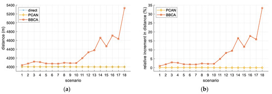 To better analyze these results, Figure 8b shows the increase in the distance traveled by the UAVs when using PCAN and BBCA relative to the minimum distance provided by the direct algorithm. As we can see, the penalty in the distance for BBCA is appreciable in some scenarios. In PCAN, this increase is negligible again (about 0.11% in the worst case, but about 0.06% in most of the scenarios).