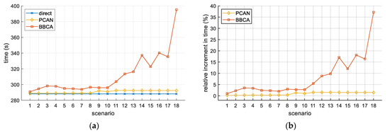 Analogous to Figure 8b, Figure 9b shows the relative increase (with respect to the direct algorithm) in the UAV flight time when using PCAN and BBCA. For PCAN, we can observe an increase of less than 2% in all the scenarios. One more time, the penalty introduced by BBCA in some scenarios is notable.