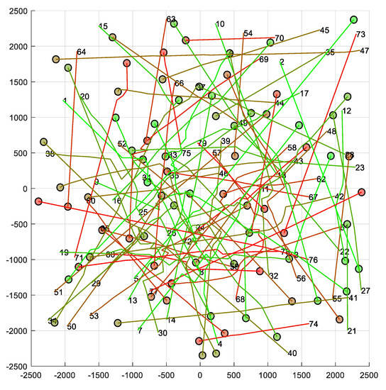 Random scenario with 80 UAVs and PCAN. Each number represents the initial position of a UAV; each circle represents the current position of the UAV and its safety radius; each line represents the trajectory followed by the UAV. Units on the X and Y axes are meters.
