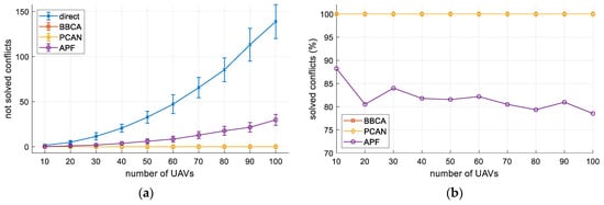 The abscissa axis in the plot of Figure 11a indicates the number of UAVs in the flight region. In contrast, the ordinate axis shows the mean number of conflicts produced and the corresponding standard deviation. For the direct method, conflicts increase exponentially with the number of UAVs in the region. The APF algorithm manages to resolve isolated conflicts, but its performance decreases as the UAV density increases. BBCA significantly reduces the number of conflicts but does not eliminate them. Finally, as expected, PCAN successfully resolves all the conflicts.