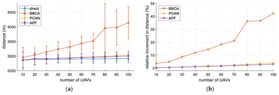Multi-UAV study. Distance traveled: (a) absolute values (mean and standard deviation); (b) relative increase with respect to the direct algorithm.