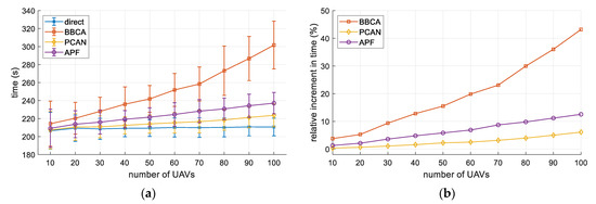 Multi-UAV study. Flight time: (a) absolute values (mean and standard deviation); (b) relative increase with respect to the direct algorithm.