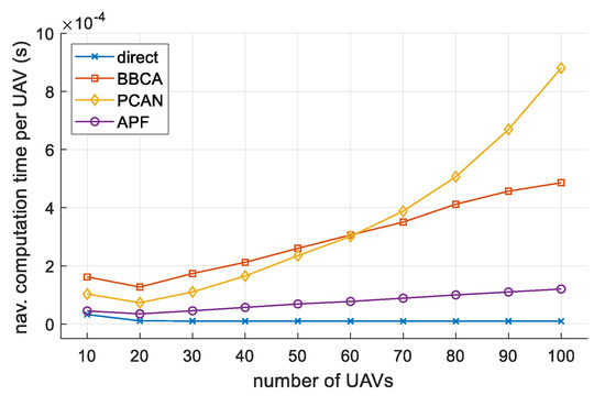To conclude the analysis, we studied the time used by the direct, PCAN, BBCA, and APF algorithms to offer their solutions. Figure 14 shows the time consumed to produce an output for every UAV each time the navigation computation is executed, expressed in milliseconds. Results were generated with an Intel i9-10900KF@3.7GHz processor, using one core.