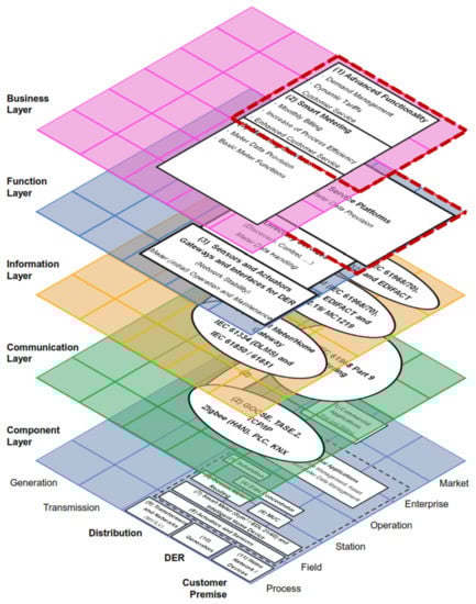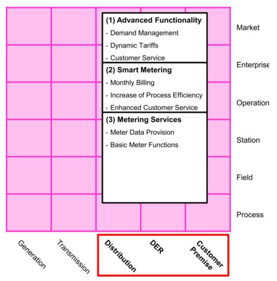 The SGAM business layer defines AMI’s goals for Smart Grids. These goals can include the basic functionalities of the smart metering system to the implementation of dynamic tariffs, billing, and demand management, among others. The function layer describes the platforms and services that fulfill the necessary functions to meet these goals. Thus, this layer offers metering data provision: customer databases, consumption information from each meter (power active or reactive energy), tariff schemes, and system events (interruptions, failures, connections, and disconnections), among others.