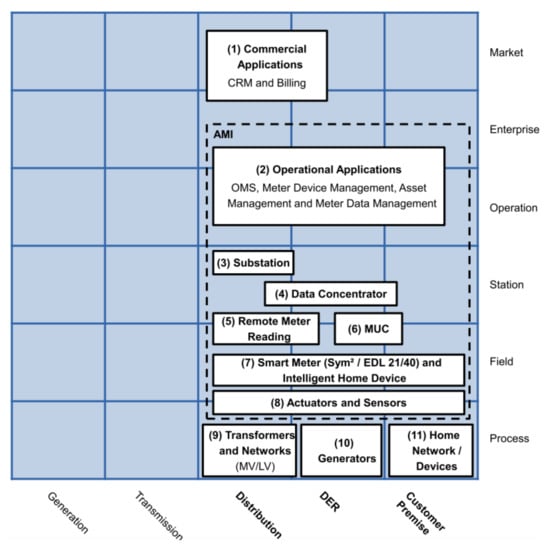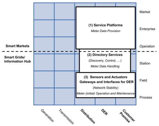 - AMI function layerThis layer depicted in Figure 3 defines the necessary functions; generally, Information Technology (IT) functions to achieve the goals established in the business layer. The layer presents three functional blocks: service platforms, directory services, and sensors or actuators. Service platforms are the metering data preparation for different roles, like the distribution network operator, DER operator, or customer. Directory service relates to the functions of controlling and accessing measuring devices. Sensors and actuator gateways refer to the interfaces for accessing and controlling such devices.This layer may be the most important for its role as a data provider for different applications. It involves the distribution, DER, and customer premises domains. It also covers the zones of operation, enterprise, and market.The German Federal Network Agency coined two terms in this context: Smart Grids and Smart Markets. Here, Smart grids refer to the operation of the network and its service provision infrastructure. Concerning IT functions defined in the function layer, these components act as an information hub. Smart Markets refer to instances outside the physical infrastructure of the network to trade services among market participants according to the available capacity of the network [].