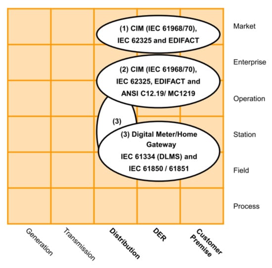 - AMI information layerThe IEC Seamless Integration Architecture (SIA) was defined by the IEC Technical Committee 57 “Power Systems Management” (TC 57) []. Into SIA, the Common Information Model (CIM) serves as an information model for all entities participating in the market []. According to [], the AMI information layer presented in Figure 4 contains three standard groups that define information models.The first group contains market-related standards and regulatory data formats. The second group includes relevant standards for the company and operation areas. The third group considers standards focused on the integration and control of measurement devices in the field zone.