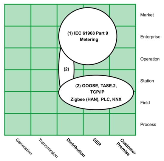 - International Electrotechnical Commission. IEC TR 62357-1:2016 Power Systems Management and Associated Information Exchange—Part 1: Reference Architecture; Technical Report; American National Standards Institute: Geneva, Switzerland, 2016. [Google Scholar]
