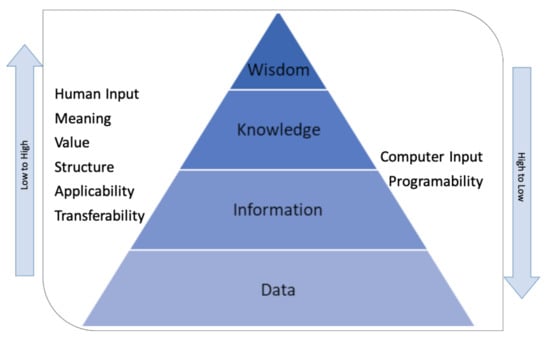 In 1989 Russel Ackoff first proposed the wisdom concept as a hierarchical structure to define the evolution of an entity from its data character to a higher level []. In his work, the hierarchy included the following stages: data, information, knowledge, understanding, and wisdom. However, several authors in the literature prefer to place the understanding as part of the knowledge [].