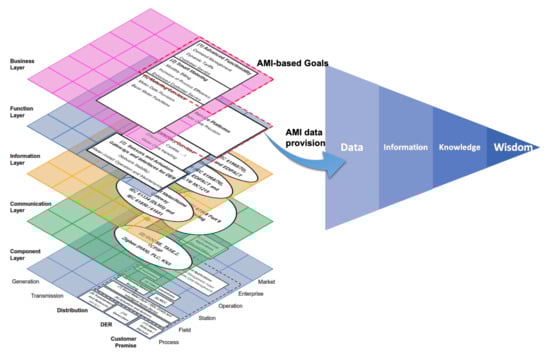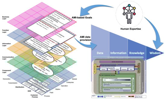 Figure 9 presents, on the one hand, the SGAM architecture and AMI components in Smart Grids. On the other hand, the DIKW hierarchy sets the goal of transforming data into wisdom. The next step is to establish a method that allows this transformation process, which requires consideration of the nature of AMI data, such as the volume, velocity, and variety. These characteristics are the principal components (also known as 3V) of Big Data []. Volume involves a growing number of smart meters. Velocity refers to data generation at shot time intervals. Variety refers to the different platforms where data may come from, depending on the application: smart meters and external sources, such as weather databases or Geographic Information Systems (GIS).