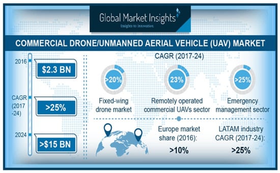 During the last two decades, unmanned aerial vehicle (UAV) has been deployed to perform high risky operations where deploying humans presents great danger to their health notably in fire-fighting [,], chemical spraying [,,], search and rescue missions [,], disaster network communication [,] and surveillance operations []. Undoubtedly, UAV will be pivotal in medical and blood delivery for troops in the frontline when it is dangerous to send in medical personnel. The market of UAV has a positive outlook, as could be seen from Figure 1. The major drivers of the UAV market are the remotely operated commercial UAV and the emergency management sector. Particular interest is the remotely operated commercial UAV where the channel model ranges from direct line of sight (LoS) to non-LoS propagation communication []. UAVs are deployed in urban, semi-rural, and rural environments which are fully captured using LoS and non-LoS scenario. Each environment characterized by different link obstacle topology. For instance, in the rural area where there is less obstacle, the channel model conforms to the free space path loss model suitable for LoS communication. Different from the NLoS model, the UAV ground control station (GCS) deploys the LoS model to focus the antenna beam directly to the airborne UAV using a highly directional antenna rather than an omni-directional antenna to maximize the received signal power.