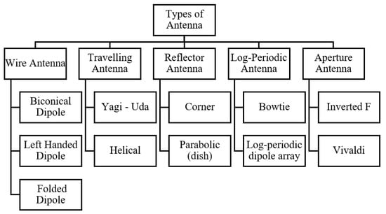 Antennas deployed in a UAV tracking system must conform to either as a steering beam (SB) or an array antenna (AA) format. The SB configuration involves just only one antenna unit, such as parabolic dish. However, the AA entails the fusion of many micro antenna elements to functions as an antenna structure. In this section, we present a brief overview on the different antenna and antenna arrays suitable for deployment as a UAV antenna tracking system. Some of the examples of the notable antennas are classified, as shown in Figure 3 and discussed hereafter.