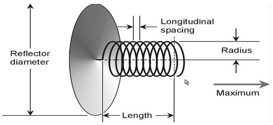 A helical antenna has one or more conducting wires wound in such a way that the shape looks like a helix and hence the name. Helical antenna has been extensively used in practice for many years because of the practical emission and how easy it is to use [,]. The properties of this type of antenna is extraordinary and exceptional and as such, they are widely used in getting microwaves from VHF []. The helical antenna is also used in satellite communication due to the high gain requirement. Figure 6 demonstrates the structure of the helical antenna [].