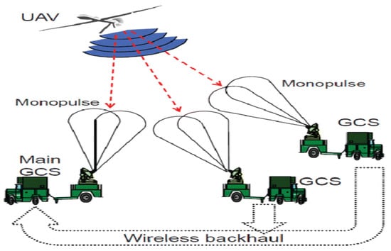 This technique is not as popular as the ground-to-air type of tracking systems. In this design, the tracking is performed by the airborne platform. For the case of the UAV, the UAV uses a directional antenna to send the signal while an omnidirectional antenna is solely for the tracking antenna. The directional antenna on the UAV is desirable because it reduces the burden of detecting the angle of arrival (AoA) of the arrived signal. Despite its challenges, some authors have deployed this scheme [,]. Their result shows that the tracking antenna continuously keeps track of and aligns with the base station and GCS, respectively, with the minimum error possible. However, this design is limited to ground based vehicles provided there is an available LoS between the sender and receiver. Reference [] presented a brief overview of waveforms for UAV air-to-ground communication systems. The researchers broadly divided the modulation schemes into single carrier and multicarrier. The single carrier modulation are: QPSK, APSK, OFDM, MQAM, GMSK, MSK, SOQPSK, SC-FDE. However, the multicarrier is the OFDM. Additionally, [] conducted air-to-ground UAV tracking although using a MIMO beam-forming technique which showed promising results.