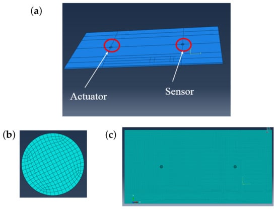 (a) FEM model of the aluminum plate with adhesive and PZT sensors; (b) meshed view of the PZT sensor; (c) the meshed plate with adhesive and PZT sensors.