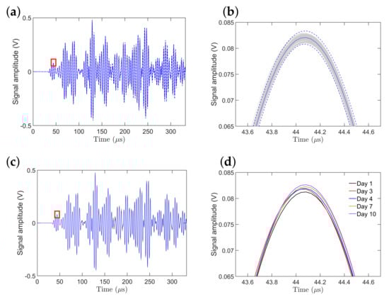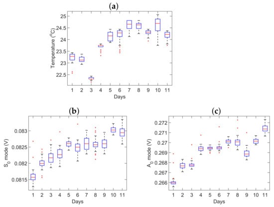 Figure 4c presents the mean signals (mean of 40 signals) for each day. Figure 4d presents a zoomed-in version of the third peak (highest peak) of the mode for a few selected days from Figure 4c. The overall trend of the amplitude of the highest peak of the mode can be explained in connection with Figure 5a. Figure 5a shows the temperature distribution for each of the 11 days. The box plot for each day shows the distribution of 40 recorded temperatures, which corresponds to the forty recorded guided wave signals obtained at different times within a single day. The horizontal red line in the boxplots represents the mean value of the temperature distribution. The blue box represents the inter-quartile range, that is, from 25th to 75th percentile values. The two whiskers on both sides represent the range that is times the inter-quartile range. The red dots represent the individual outliers or the values that fall outside the times the inter-quartile range. From day 1 to 11, an overall upward trend of temperature distribution (from to °C) can be observed although there are certain exceptions. It can be observed from Figure 4d that the amplitude of the signal gradually increases as the temperature increases in the specified days.