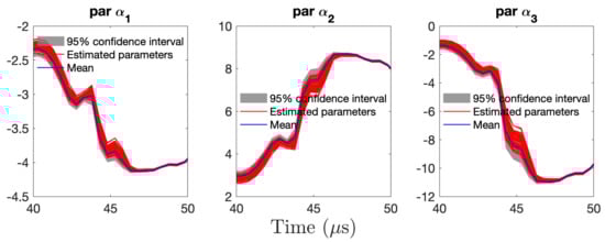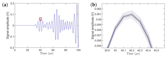 Figure 4a shows 440 experimental signals, collected during 11 days (during each day 40 data sets were collected at different times), having an initial length of 8000 sample points (not down-sampled) with a signal length of 332 s. The signal segment from the time instant of 33 s to 50 s constitutes the mode while the signal segment from 60 s to 78 s constitutes the mode. After the time instant of 78 s, the rest of the peaks are considered as coming from the boundary reflections. Figure 4b, that presents a close-up of the third peak of the mode, clearly shows the variation between the signals collected during the 11 days. The dotted blue lines represent standard deviations of the signal. The solid blue line represents the mean of all 440 signals. The amplitude of the third peak of the mode, which is the most prominent peak in the mode, varies between and V with the mean being V.