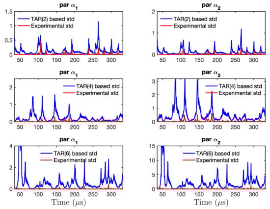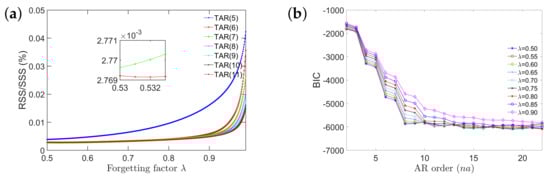 Model structure selection refers to the selection of the TAR model order and forgetting factor , and is generally based on trial-and-error or successive fitting schemes [48], according to which models corresponding to various candidate structures are estimated, and the one providing the best fitness to the non-stationary signal is selected. The fitness function may be the Gaussian log–likelihood function of each candidate model. The particular model that maximizes it is the most likely to be the actual underlying model responsible for the generation of the measured signal, in the sense that it maximizes the probability of having provided the measured signal values, and is thus selected. A problem with this approach is that the log–likelihood may be monotonically increasing with increasing model orders, and as a result, the over fitting of the measured signal occurs. For this reason, criteria such as the AIC (Akaike information criterion [69]) or the BIC (Bayesian information criterion [70]) are generally used and can be represented as follows: