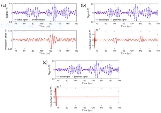 The TAR model to be estimated is explicitly parameterized in terms of the specific parameters to be estimated. Thus, both the AR parameters and the one-step-ahead prediction error (residual) signal are designated as functions of these parameters. For the residual signal, in particular, this signifies the fact that it is obtained based upon the current model parameters and the available guided wave signal (using the TAR model expression in Equation (6)). Thus, the “best” model may be selected/estimated as the model with parameters that minimize the prediction error.