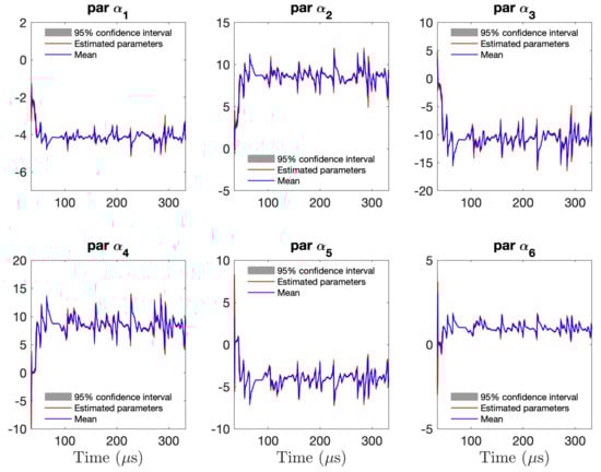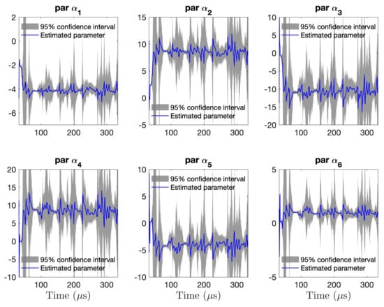 In these expressions designates minimizing argument, and the model’s one-step-ahead prediction error made at time without knowing the model parameter values at time t as it would be normally necessary. Of course, as indicated in the expression above, for slow parameter evolution. The term is a window or weighting function that for assigns more weight to more recent errors [68] (pp. 378–379). The quantity is referred to as the “forgetting factor”. The smaller the value of , the faster older values of the error (and thus the signal) are forgotten, thus increasing the estimator’s adaptability, i.e., its ability to track the evolution of the dynamics.