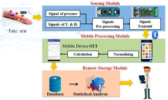 In this paper, a system for measuring the humidity, temperature, and pressure caused by the cast on the skin was proposed to provide an objective factor of casting on a practice simulated arm for young physicians in real-time. The data detected by the system will be uploaded to the database to observe the process difference between the clinical practice and teaching. In this system, the physiological sensors’ deployment, sensing module, and embedded broad for controlling and communication were required firstly. Secondly, the readable pressure data were obtained by embedded broad with the processing module. Then, these data were transmitted to the smart mobile device through Bluetooth. Finally, the data, such as humidity, pressure, and temperature, were uploaded to the database via the Internet in real time. To be observed easily, the different kinds of data are displayed by different colors. The humidity and temperature sensors were deployed close to the affected area. The pressure sensor was deployed in an area where pressure is suspected. The system architecture we proposed in this paper was shown in