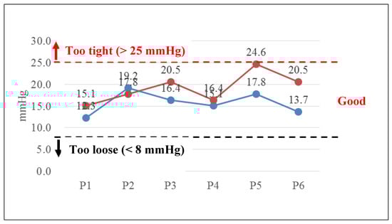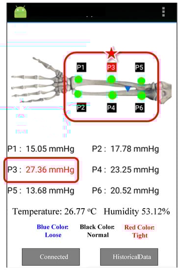 13]. When the pressure is within 8–25 mmHg, the color of the pressure number on the mobile application is black. When the pressure is less than 8 mmHg, the cast is classified as too loose. The color of the pressure number on the mobile application will become blue. When the pressure is greater than 25 mmHg, the cast is classified too tight. The color of the pressure number on the mobile application will become red on the mobile application, as shown in