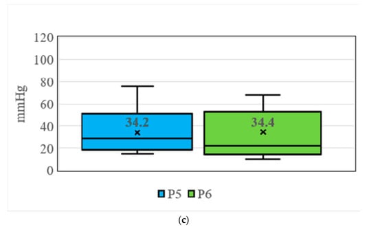 Figure 8b. On the P5 and P6 positions, the mean pressures were 34.2 mmHg and 34.4 mmHg when the 6th-medical students applied the short arm plaster cast. The pressures were lower than P3 and P4, but still higher than safe range, as shown in