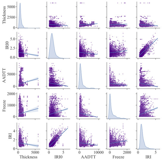 - By analyzing the importance of the variables to the model, we can see the degree of influence of each variable. IRI0 is the largest, followed by transverse and AADTT. Moreover, there are many additional crucial factors such as raveling and bleeding that affect IRI, leading to the LR model’s weak performance;
