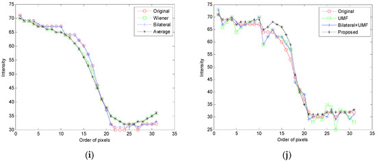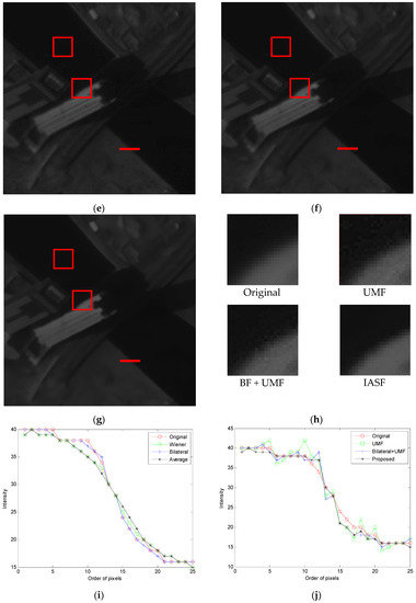 Figure 5a is the raw image data of target 3 “town” and its processed resultant images by different spatial filters, as shown in (b) to (g). The box G shows a uniform region while the box H is an edge region. The zoomed in images of the box H for UMF, BF + UMF, and IASF are shown in Figure 5h. The gray level distributions of edge I are depicted in Figure 5i,j.