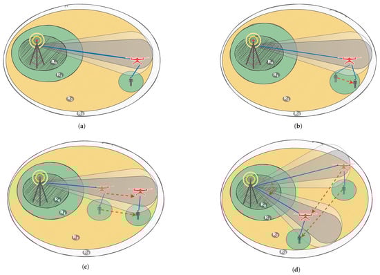 The authors of [,] show that UAVs can be cost-effectively used as aerial platforms to provide or improve communication services of ground devices. Aerial base stations (BSs) and repeaters can be considered as examples of these platforms in cases where the terrestrial cellular network does not provide sufficient coverage. The authors of [] examined possible use cases for drones to improve network performance, highlighting two main usage types: mobile-enabled drones (MEDs) and wireless infrastructure drones (WIDs).