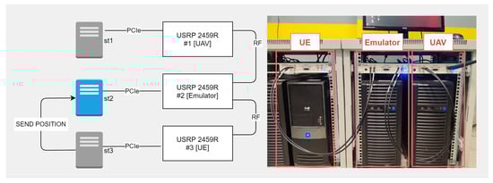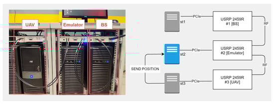Each simulation object (UAV, BS, UE, signal propagation channel) is represented as an individual SDR. In view of this fact, emulation was carried out in two stages: