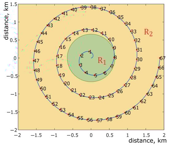 During the trial, a single user was moving through the areas along a given trajectory. When the user moves through the inner and BS coverage areas, they are directly connected to the BS; however, when they leave the BS coverage area and enter the middle area, the UE switches to the UAV located at the point where the UE trajectory leaves the BS coverage area. Figure 7 depicts the UE movement trajectory in the trial. The figure shows the BS coverage area, user trajectory and measurement points. The BS coverage area is illustrated by a green circle; the yellow area depicts the middle area. The spiral trajectory was chosen to emulate the worst case for the BS directional antenna, when it should constantly move towards the UAV that follows the user.