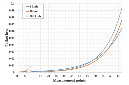 Packet loss for different UE velocities. This figure shows packet loss plotted against measurement points from Figure 7. The blue line corresponds to the pedestrian UE walking along the trajectory, the red line corresponds to the UE riding a scooter, the gray line corresponds to the UE riding a car with velocity comparable to that of the UAV.