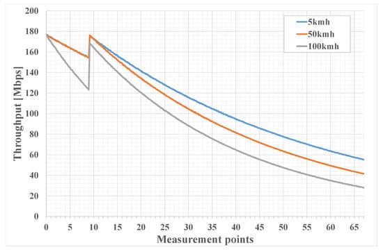 Throughput for different UE velocities. This figure shows the throughput plotted against measurement points from Figure 7. The blue line corresponds to the pedestrian UE walking along the trajectory, the red line corresponds to the UE riding a scooter, and the gray line corresponds to the UE riding a car with a velocity comparable to that of the UAV.