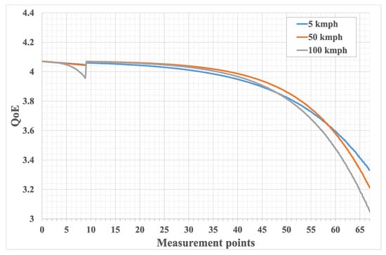 Figure 10 presents QoE results according to the methodology of []. Plot behaviour is similar to that of packet loss and throughput and can be explained in a similar manner. One can see that for the considered scenario the best possible QoE value is 4.1 and it is reached inside the BS coverage area near the center of the cell. One can also note that using a UAV as a repeater to enhance the coverage keeps the QoE above 3. This means that in the considered scenario, while enhancing cell coverage from 650 m to 2 km, the overall loss in the QoE resulted in only one point at the edge of the new coverage. Even if we add an additional condition that the quality should not fall below four points, the cell coverage can still be doubled, since even for the UE moving with the same speed as the UAV, the flight speed plot falls below four points only after measurement point 30. If we consider three points as an adequate QoE, the coverage can be increased even further.